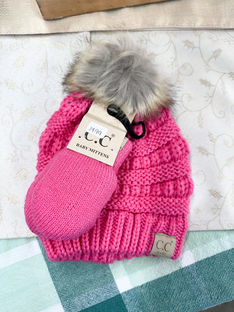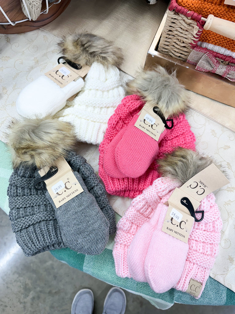 BABY Solid Knit Faux Fur Pom CC Beanie with Mitten SET