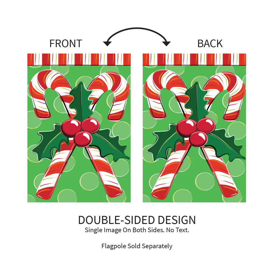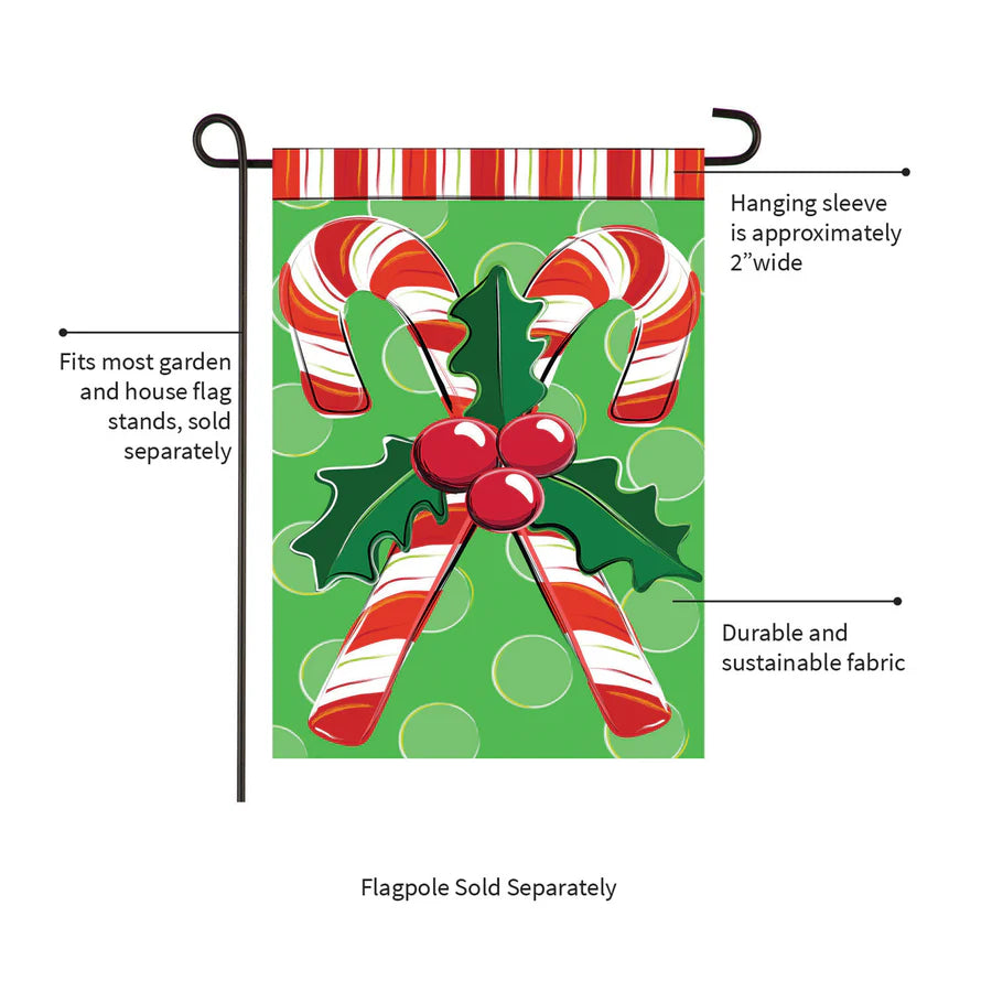 Add magic and wonder to any garden or yard when you hang up this beautiful flag. Featuring candy canes with holly and berries, this flag is perfect for the festive season. Each Evergreen applique flag is carefully crafted from multiple layers of 310 denier nylon made from recycled plastic that can withstand a variety of weather conditions. We combine pieces of fade-resistant, strong fabric with tight, detailed stitching to create a dimensional mosaic effect. The soft yet heavyweight material illuminates beautifully in sunlight. Each flag features a sleeve that fits standard flagpoles or stands, sold separately. Due to the nature of the packaging, wrinkling may have occurred. Once item is unfolded and mounted on hardware, the creases will naturally fall out. Spot clean only. Never put in a dryer. When not in use, flags can be hung in a closet or placed in a storage container.