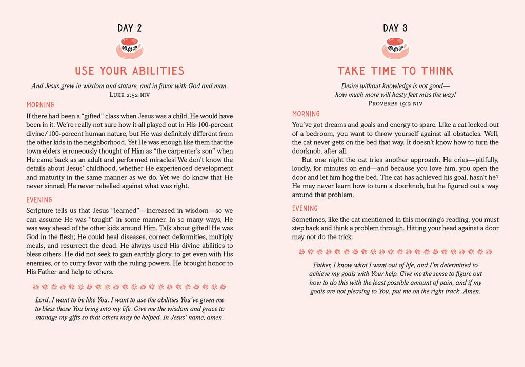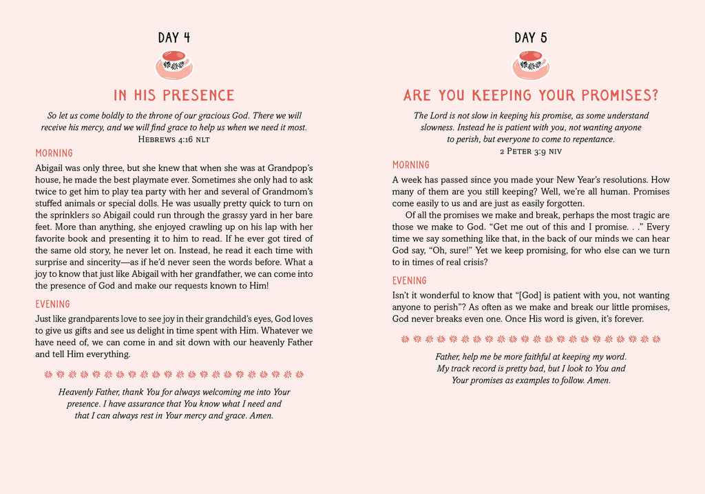 - Each Page Includes a Title, Scripture, Morning Devotion, Evening Devotion, and Prayer