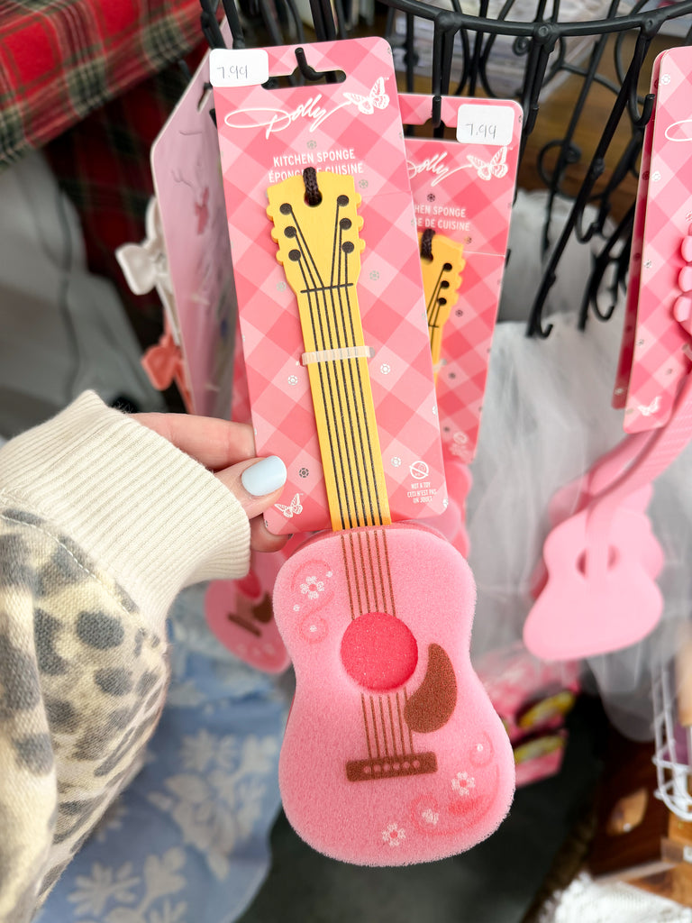 Cue the spotlight, your dishes are ready to shine! This Dolly-inspired pink guitar sponge brings star power and sparkle to your sink. With a sturdy wooden handle and a pink polyurethane sponge, it’s perfectly tuned to clean tall glasses and bottles, making it a hit in every kitchen. Packaged on a charming pink gingham backer card with foil-stamped rhinestone details.