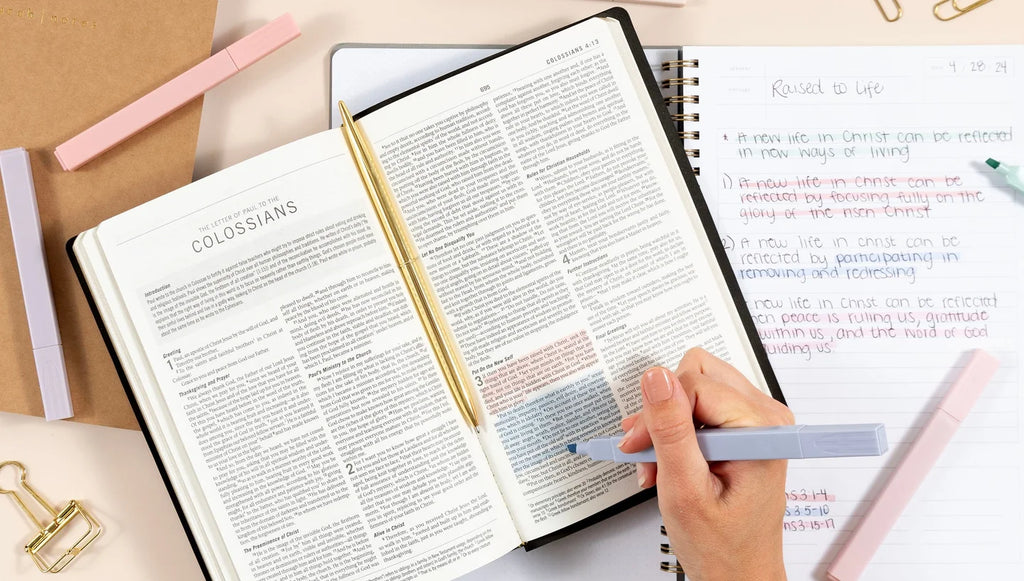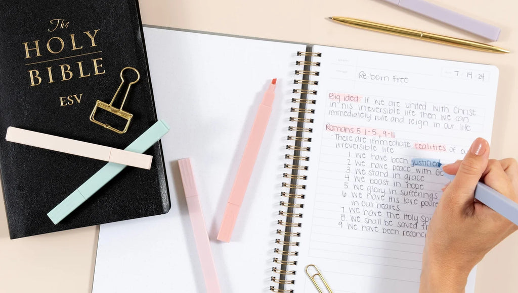 Add some color to your Bible study sessions with our Pastel Highlighter Set! With 6 trendy shades of soft pinks, purple, blue and green, these highlighters make adding a touch of color to notes and text easy and enjoyable! Plus, thanks to their quick-dry, no-bleed technology, you can make sure your special words are clear and beautiful. Highlight important verses and passages in your bible and other favorite books, or handwritten notes in your Church Notes notebooks. Whether you're treating yourself or surprising a friend, these highlighters are sure to become an essential companion for your Bible study journey.