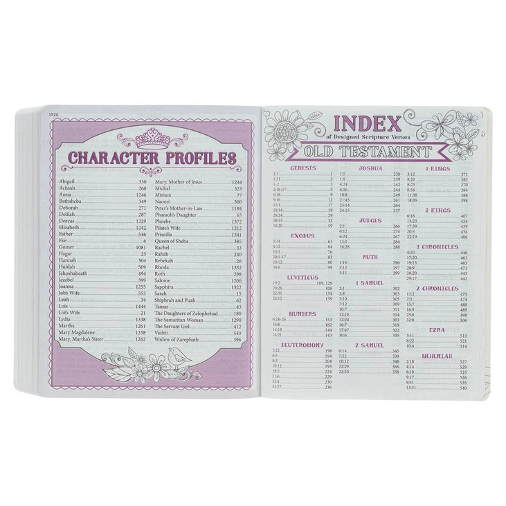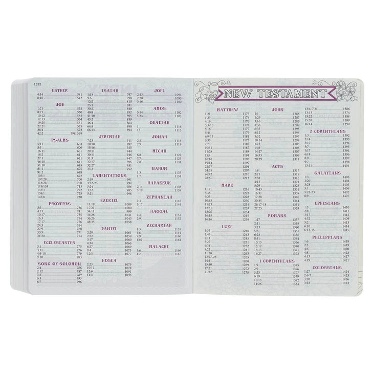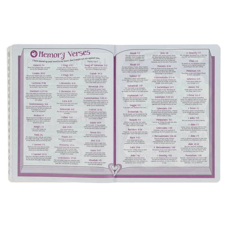 The Bile features two content lists: one lists the books of the Bible in chronological order, and the second lists the books alphabetically. A Bible Memory section includes 66 well-loved Bible verses that every Believer should know and 12 line drawing prayers that will help young girls learn to pray about everything, are ready to be colored and memorized. A line drawing illustration introduces each book of the Bible, and the content that follows is accented with pink banners and highlighted text. 366 devotions ,written by Amanda Cowles, are set in the margins and offer inspiring messages to help girls apply biblical truth to their lives. Inspirational stories of 50 memorable women characters in the Bible will motivate girls to pursue a life of faithfully following God.
