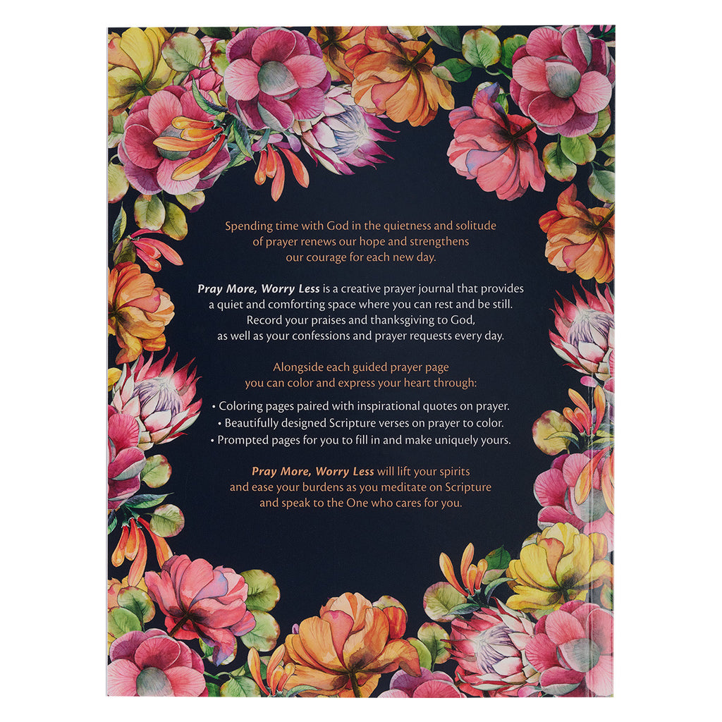 The Pray More Worry Less Coloring Prayer Journal will teach you to spend time with God in the quietness and solitude of prayer, renew your hope, and strengthen your courage for each new day. When life is busy and there are many challenges, it is comforting to have a place of prayer to retreat to. The Pray More Worry Less Coloring Prayer Journal is a creative prayer journal that allows you to record your praises and thanksgiving to God and your confessions and prayer requests.