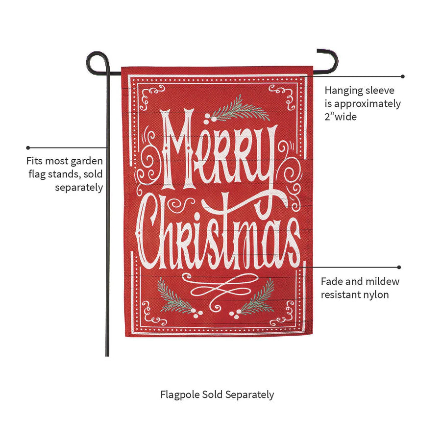 Decorate for the season and welcome friends and family to the home with this burlap garden flag. It features a bright red background with white borders and a sweet “Merry Christmas” message. Crafted of medium-weight, soft polyester burlap fabric, this flag has the look and feel of real burlap. Artwork is heat transferred onto both sides of the textured fabric to create a natural, crafted look. The poly-burlap is a durable and weatherproof material that will not fade or fray after continued use. All flags also feature a sleeve for use with any standard flagpole or stand, sold separately.