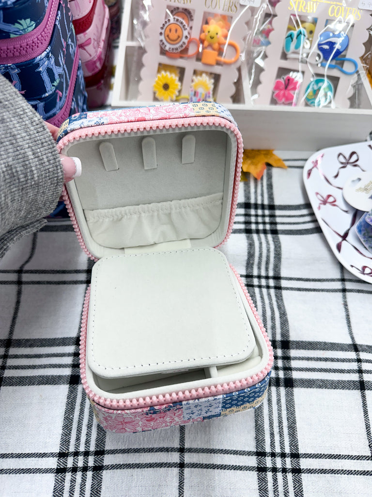 This printed jewelry box is the perfect place to store your jewelry at home or throw in a suitcase for travel. Featuring soft interior, ring, earring, and necklace storage with an interior mirror, gold hardware and Simply Southern logo. Made of 60% PVC 40% polyester.