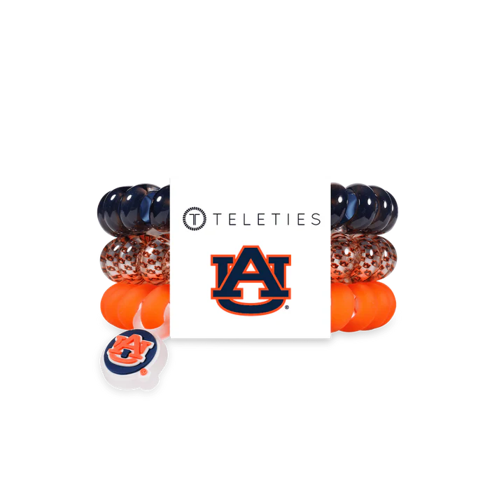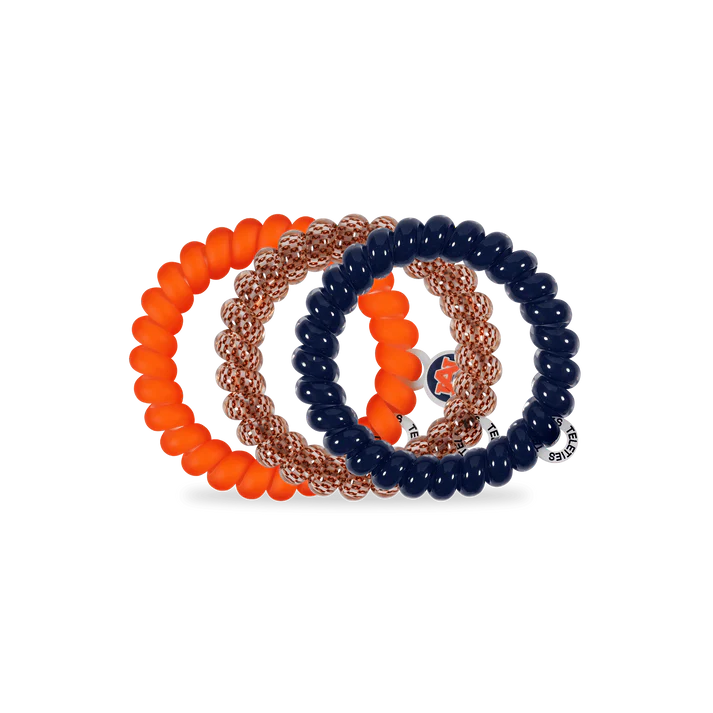War Eagle! Large Hair Ties in Orange and Navy offer a strong grip without damage, doubling as a chic wrist accessory when not in use. Your new favorite hair essentials all year round. Shop your favorite Auburn University hair accessories now! War Eagle!