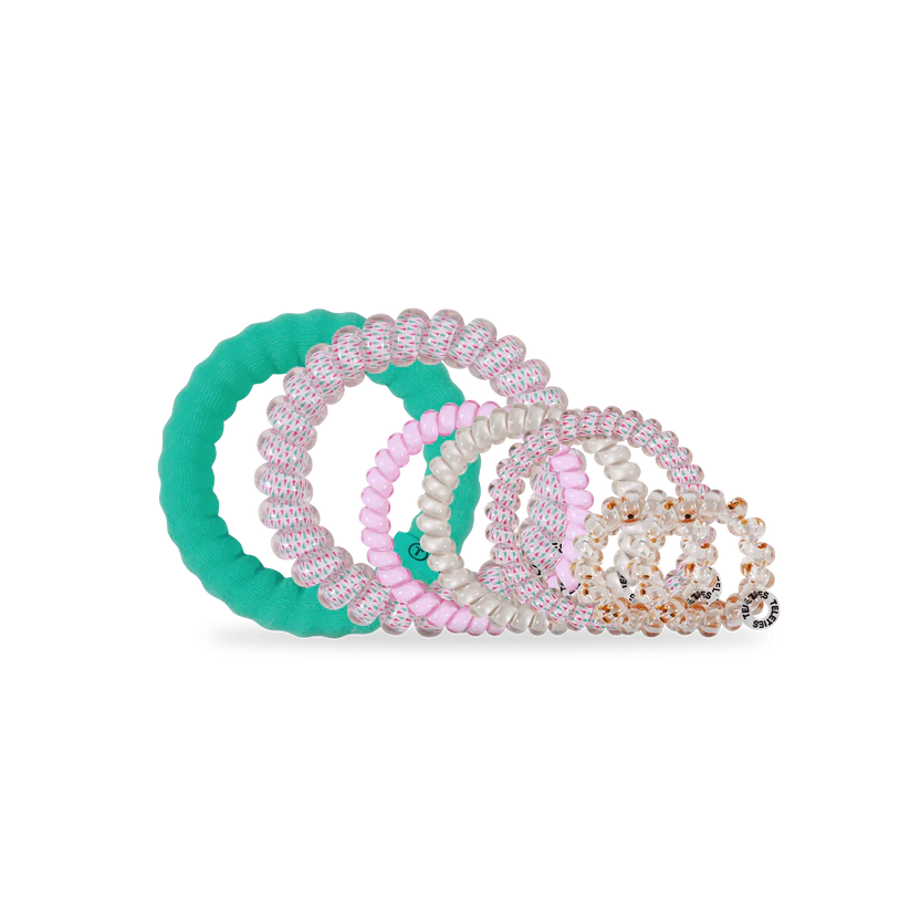 The TELETIES Christmas Tree Ornament includes 2 Tiny Hair Ties, 3 Small Hair Ties, 1 Large Hair Tie and 1 Large Nylon Hair Tie.